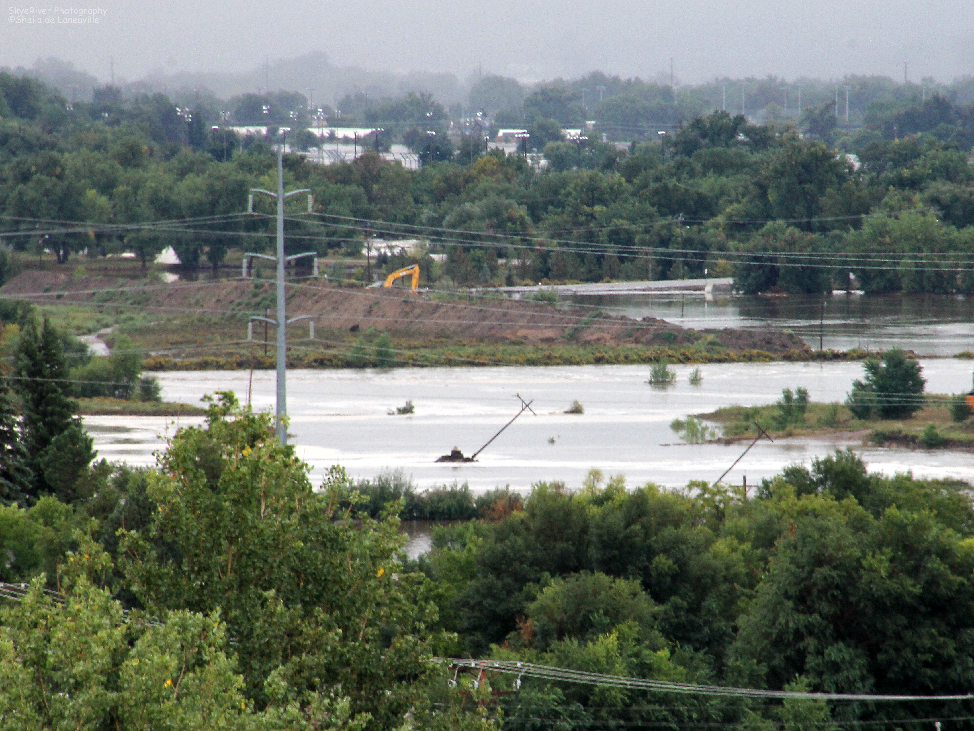 Sometime during the night, we lost power and it was restored about twenty minutes ago. Notice in the photo above, the leaning power poles. Crews probably can’t get in there, for repairs, until the water goes down. Those power lines must not have been what caused our outage.