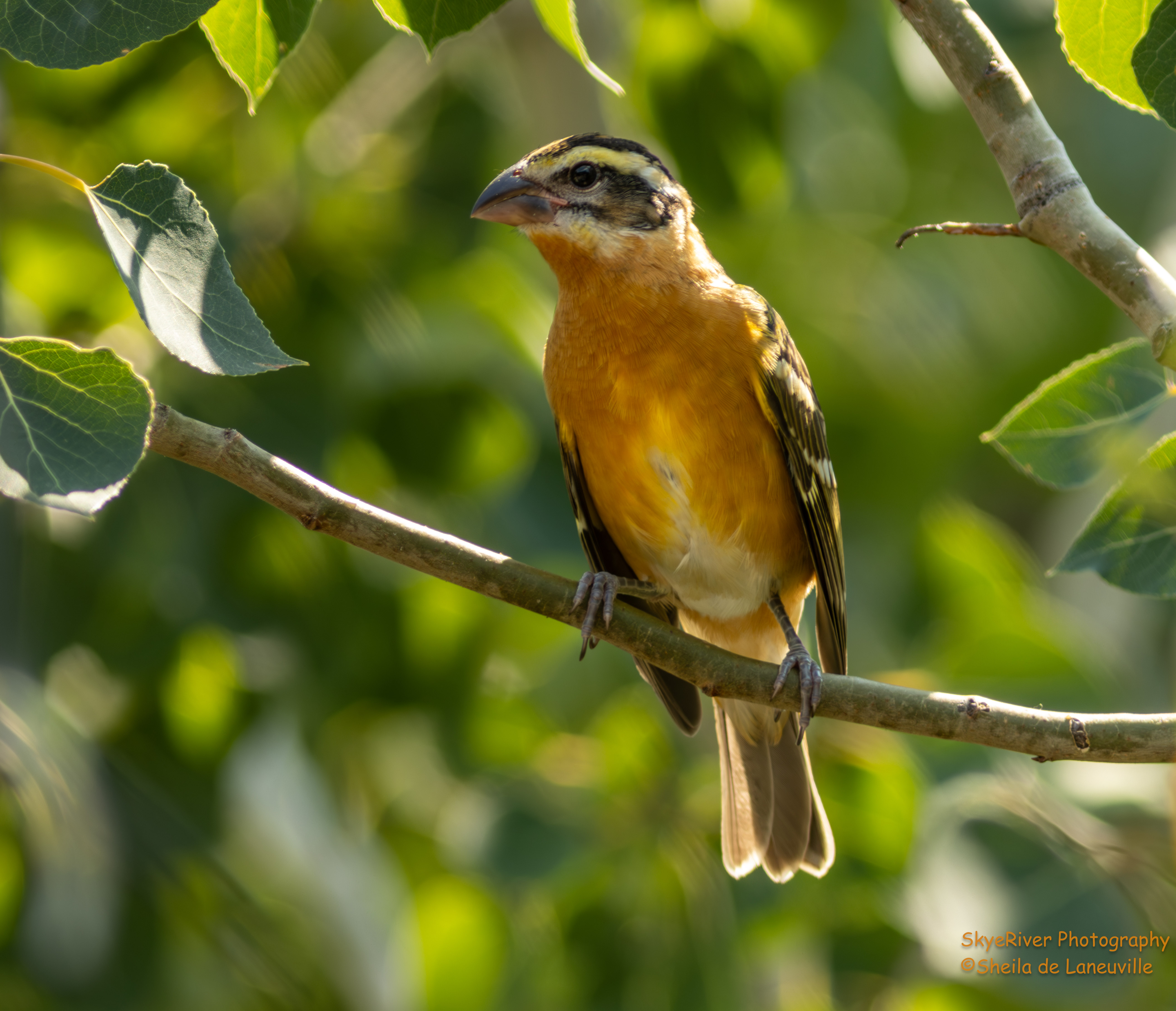 The Black-headed Grosbeak’s scientific names are both well-suited. Its species name, melanocephalus, means “black-headed.” And its genus name, Pheucticus, refers either to the Greek pheuticus for “shy” or phycticus meaning “painted with cosmetics,” fitting for a showy bird that forages in dense foliage.
