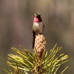 The highlight for me, this visit, were the two dueling male Broad-tailed Hummingbirds defending their territory. Each surveying their world from the high perch of their own pine tree. High into the air they would fly, soaring downward and then back up just as you think they are going to crash into the ground. Who is the bravest?