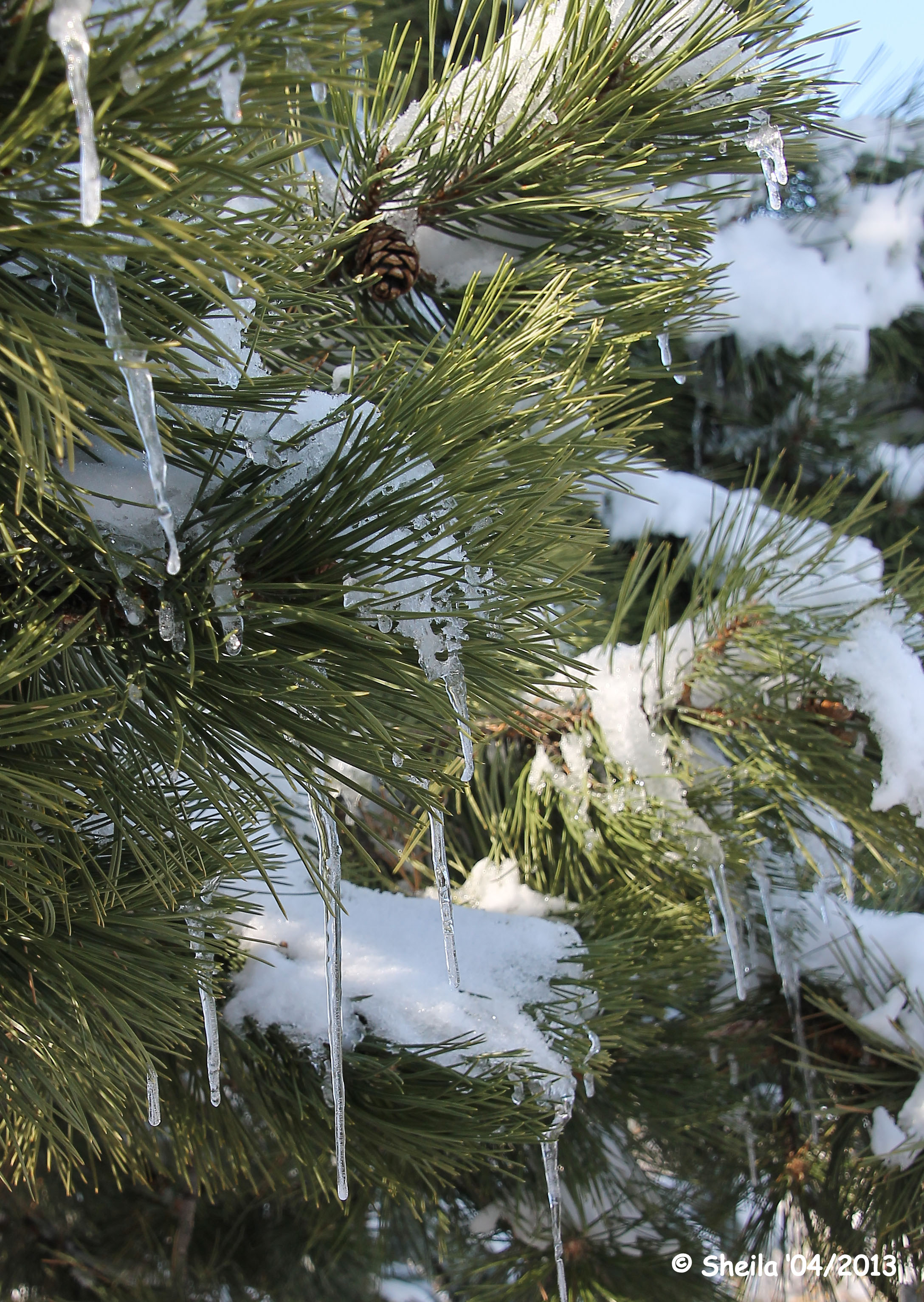 The warmer mid-day temperatures begin to melt the snow laying on the broad branches of the Blue Spruce, Austrian pines and other trees in my yard. The melting snow along with lower afternoon temperatures creates icicles that hang from the tips of the tree branches. It appears as if someone decided to decorate the trees with ornaments. I don’t recall seeing such an occurrence – nature has created a delightful site!