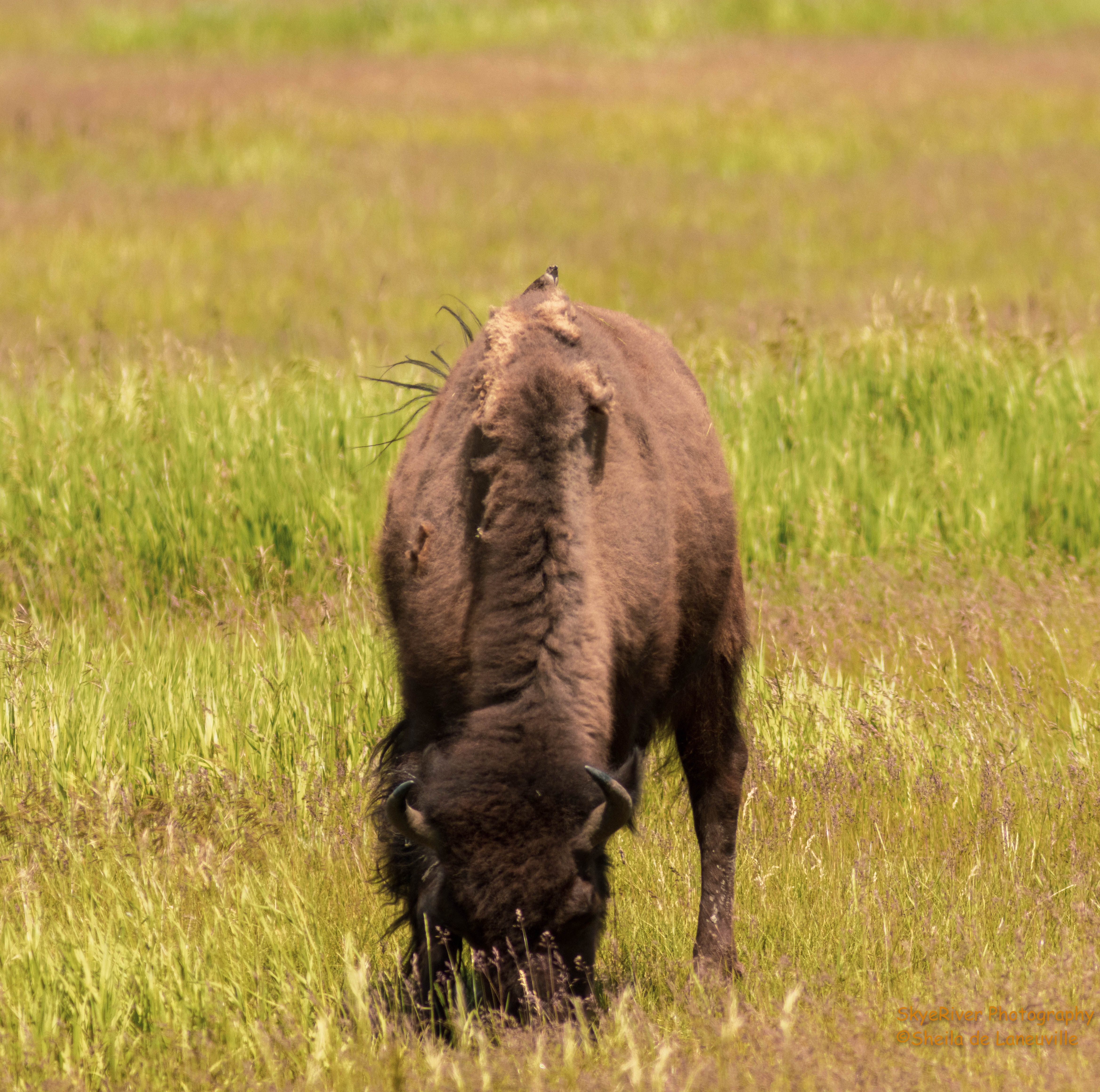 I don’t have a really good photo of the Bison, because they don’t seem to look up very much; too busy eating. Plus they were just off the road with lots of cars coming and going. However, it was fun to see the bird on one’s back.