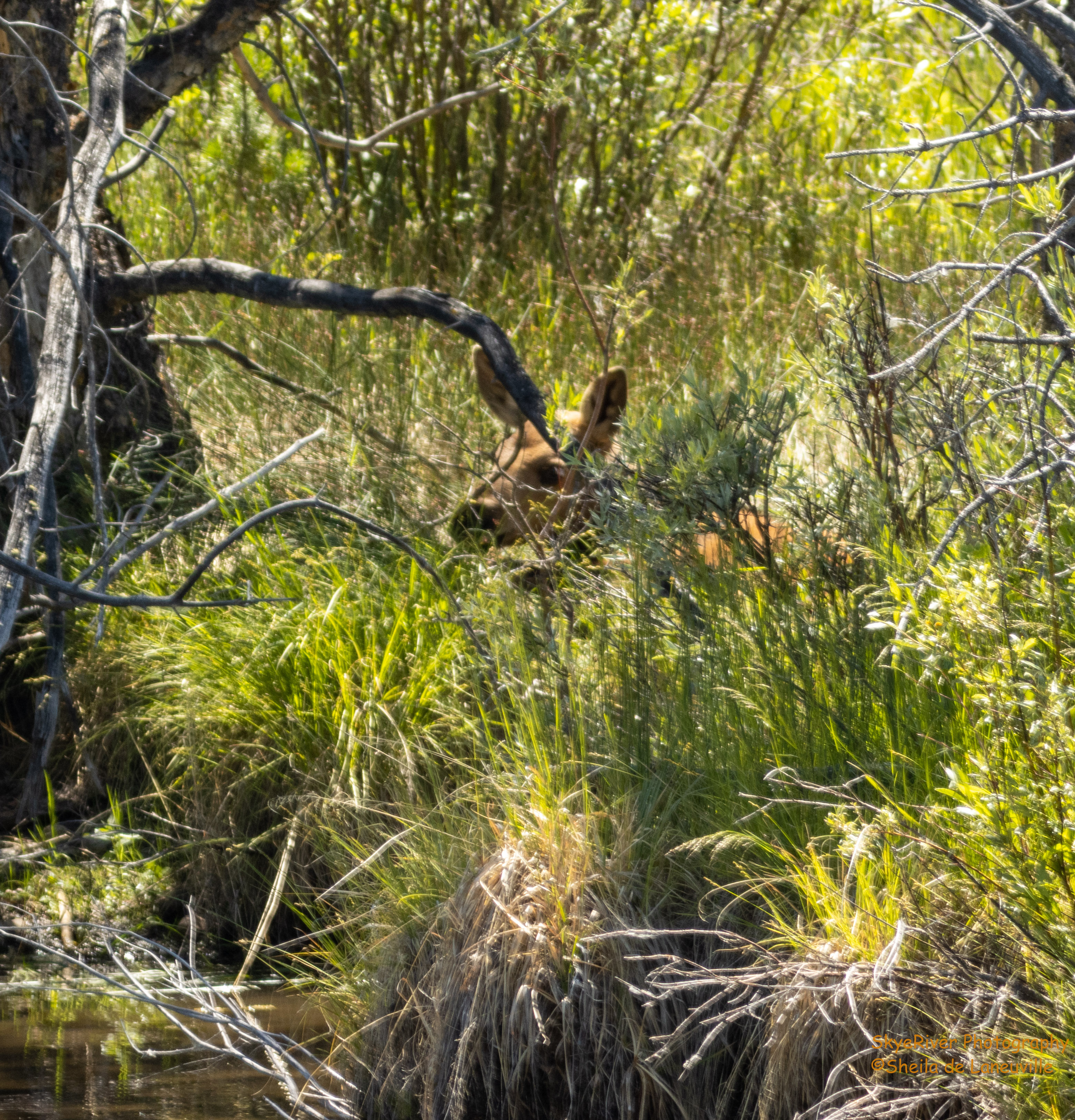 Taking a nap.Calf nursing.Perhaps a yearling, getting a sip of water.They haven’t lost all their winter coat yet.Cooling off.I think Mom has had enough. The calf was ramming her pretty hard.