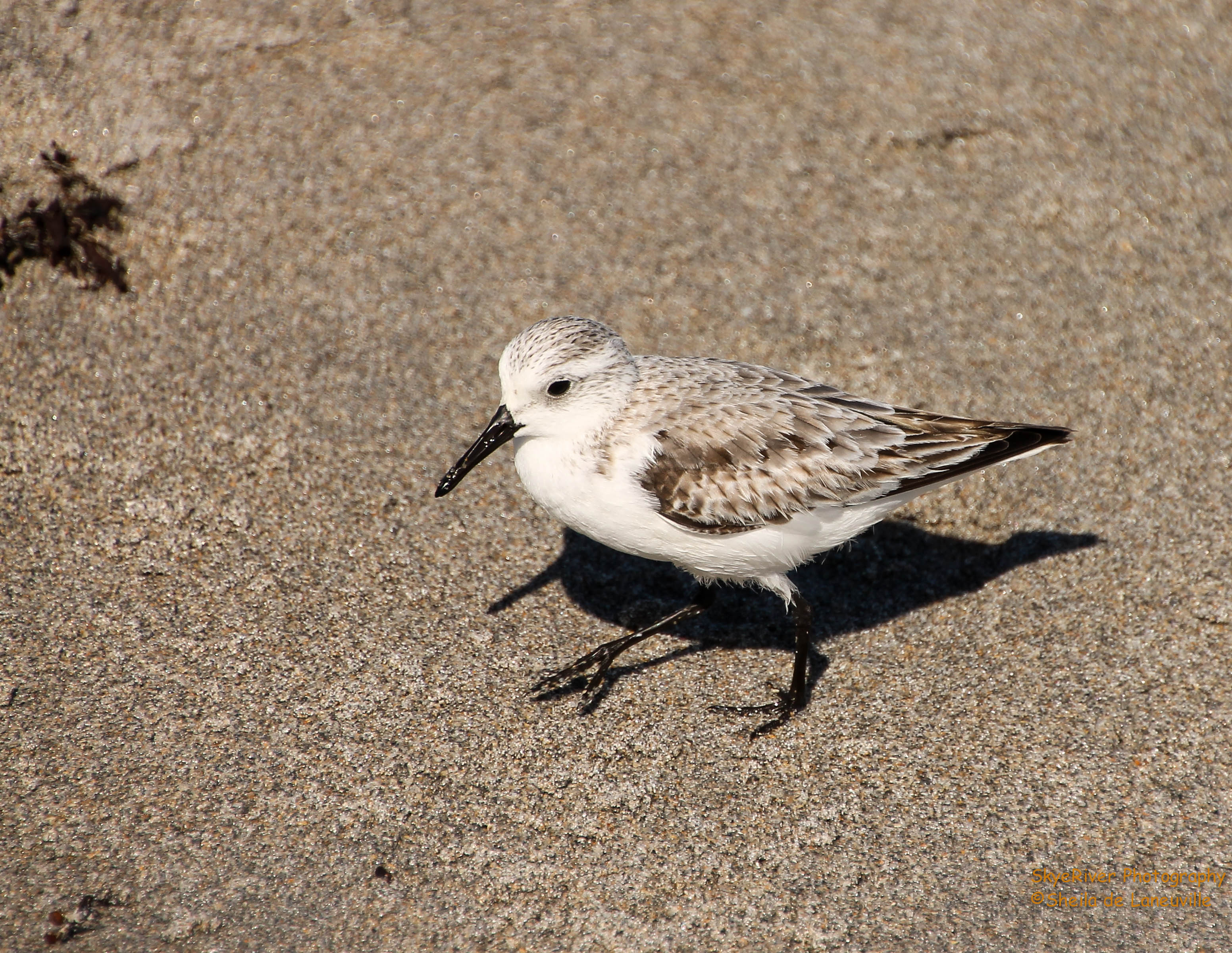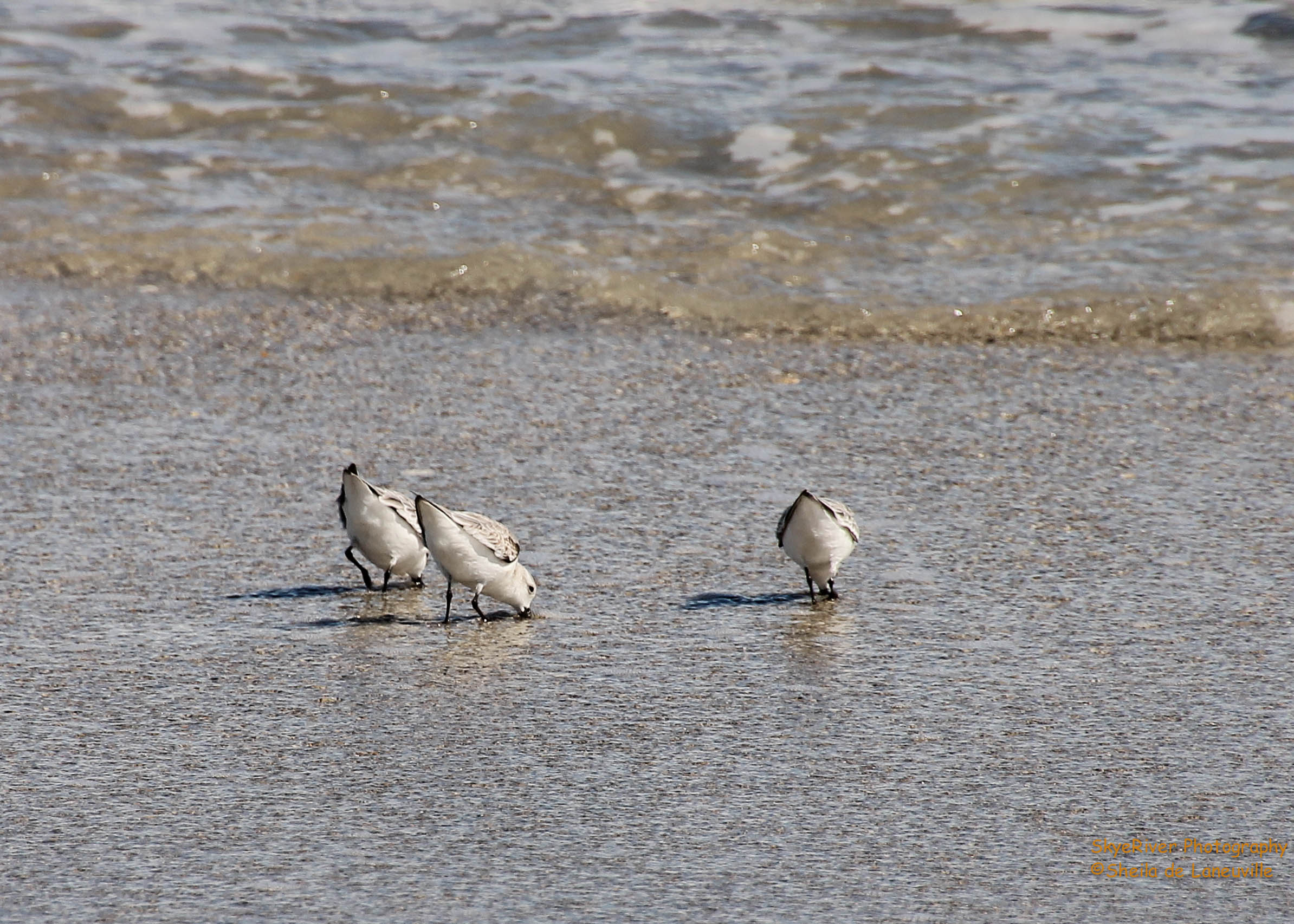 A Sanderling, hunting for food along the shoreline and competing with dozens more that wanted the tiny morsel she was able to catch.