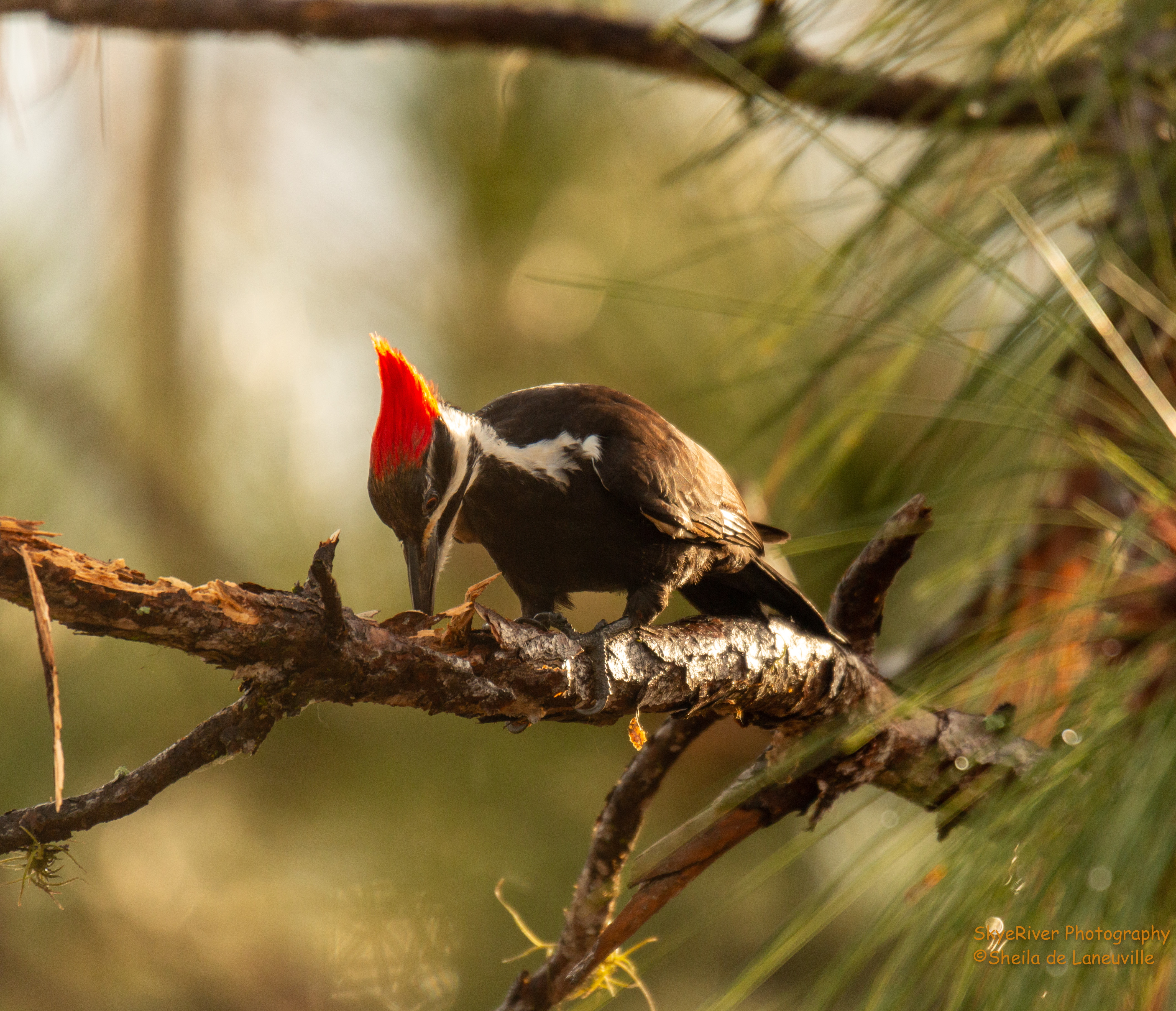 Wood chips were falling from the air. I looked up and noticed the reason why. This beautiful woodpecker was, I presume, hunting for bugs in this Pine tree.
